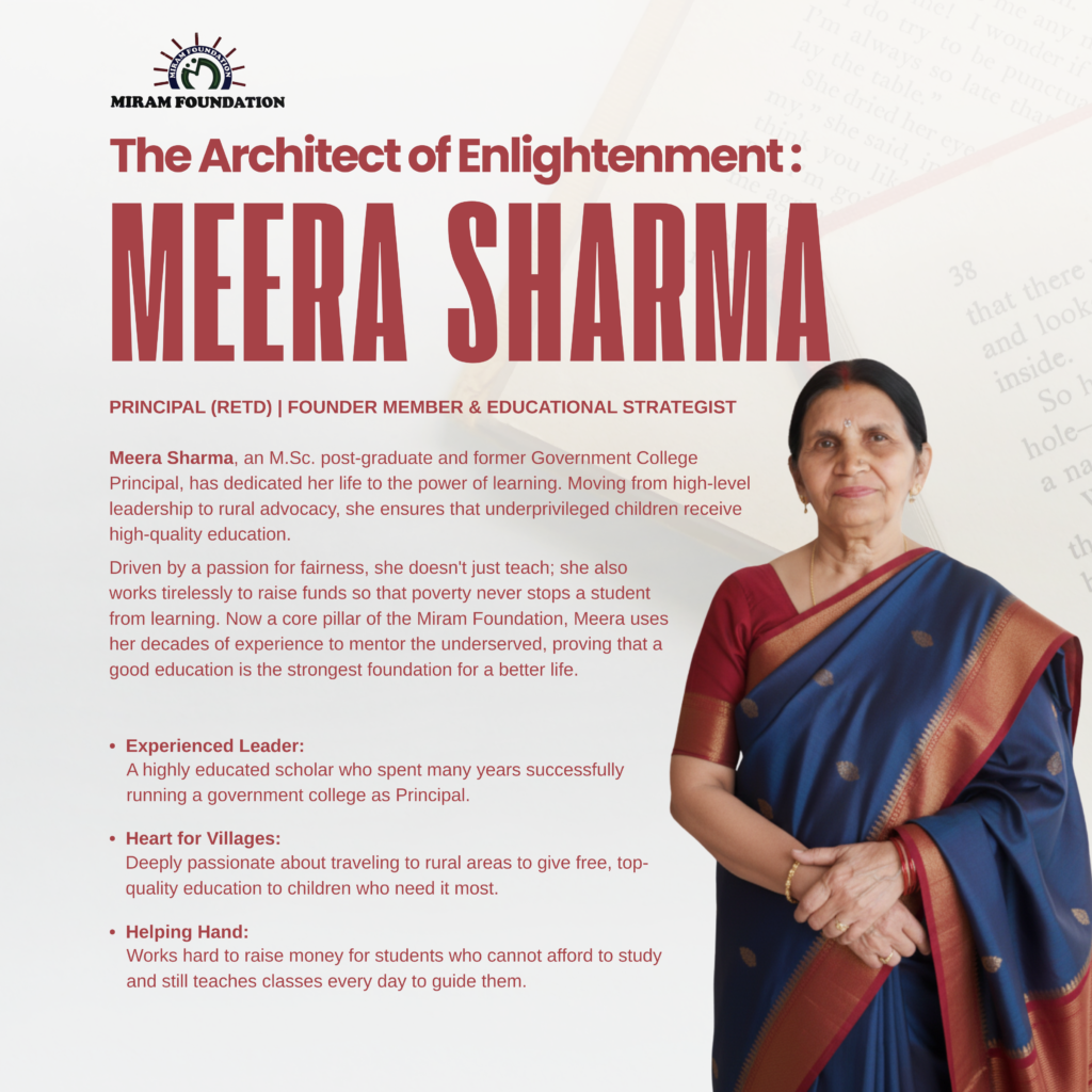 As a founding pillar of MIRAM Foundation’s Education Awareness initiatives, her experience and vision continue to guide impactful learning programs. New education-focused awareness sessions, mentorship initiatives, and community learning programs will be introduced soon, further strengthening the foundation’s mission to make education accessible, ethical, and empowering.